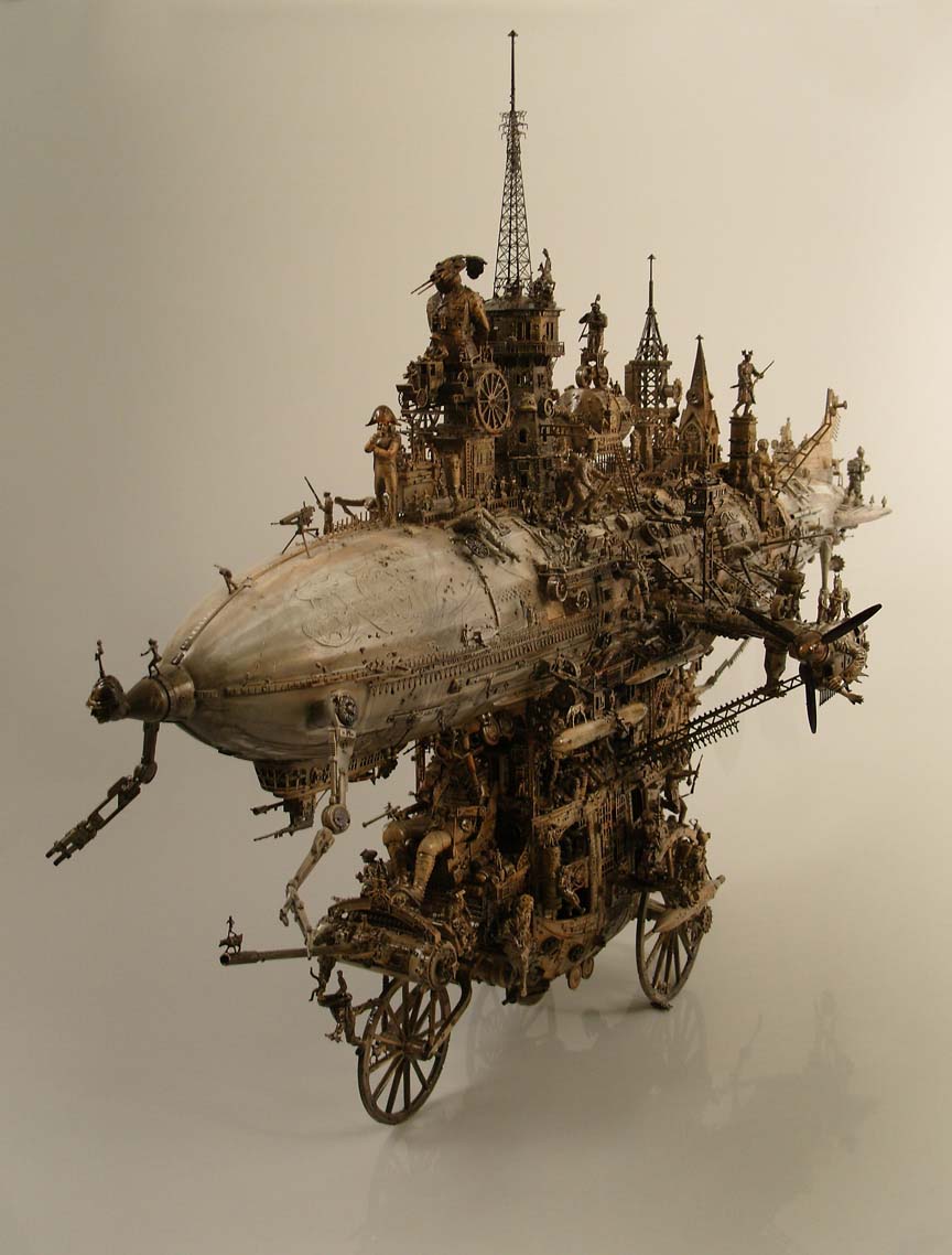 “A post-industrial Rococo master, Kris Kuksi obsessively arranges characters and architecture in asymmetric compositions with an exquisite sense of drama. Instead of stones and shells he uses screaming plastic soldiers, miniature engine blocks, towering spires and assorted debris to form his landscapes.