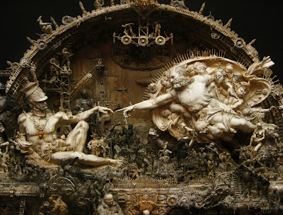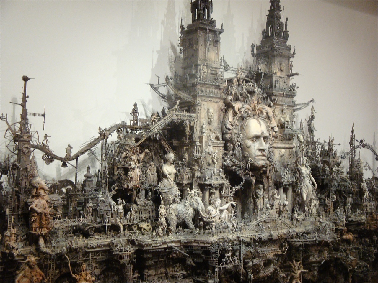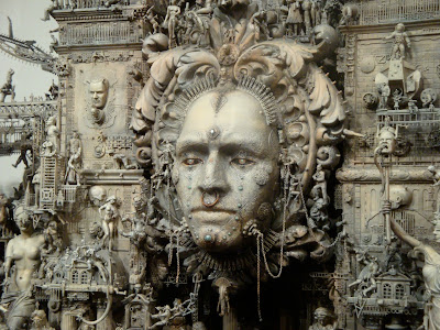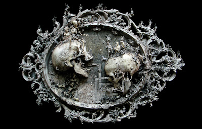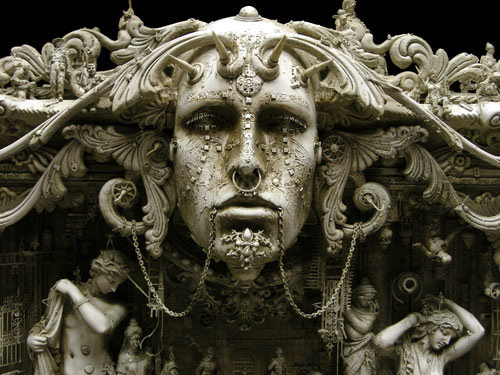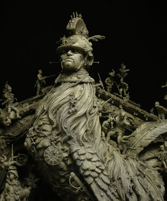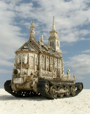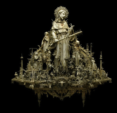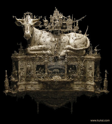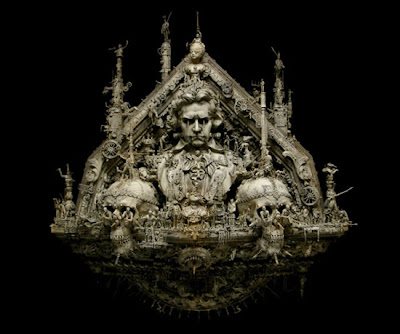 “A post-industrial Rococo master, Kris Kuksi obsessively arranges characters and architecture in asymmetric compositions with an exquisite sense of drama. Instead of stones and shells he uses screaming plastic soldiers, miniature engine blocks, towering spires and assorted debris to form his landscapes.